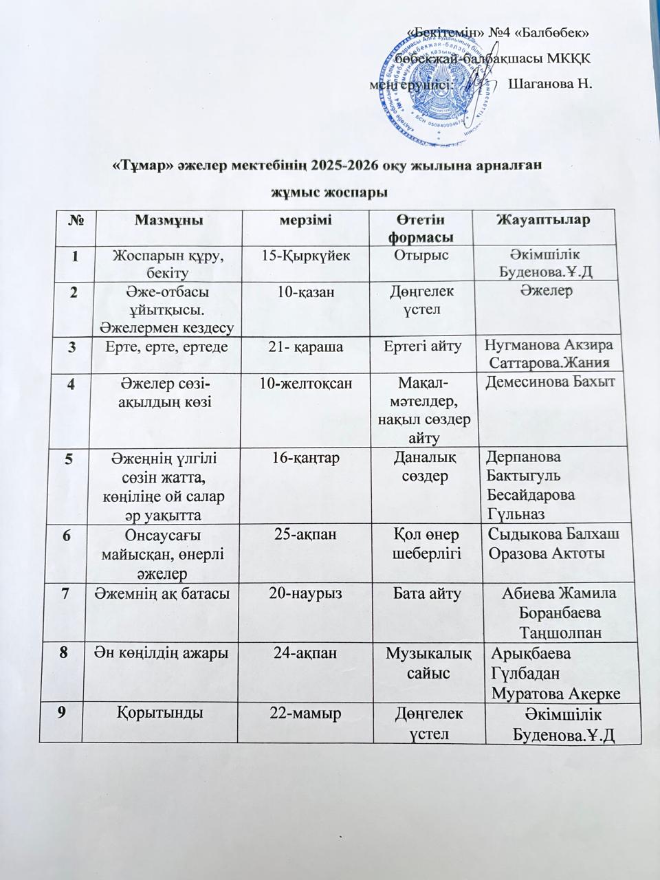 «Тұмар» әжелер мектебінің 2025 - 2026 оқу жылына арналған жұмыс жоспары