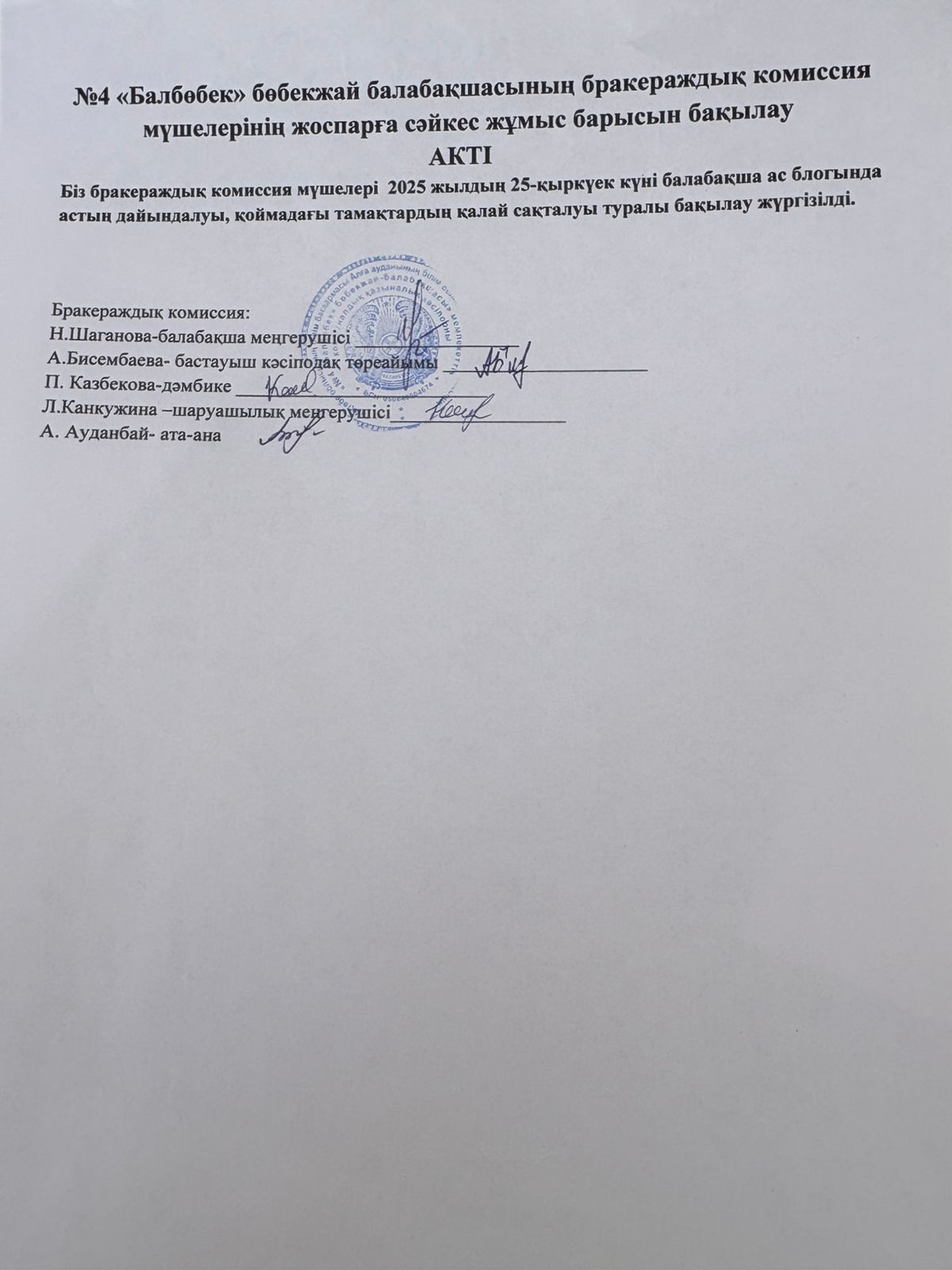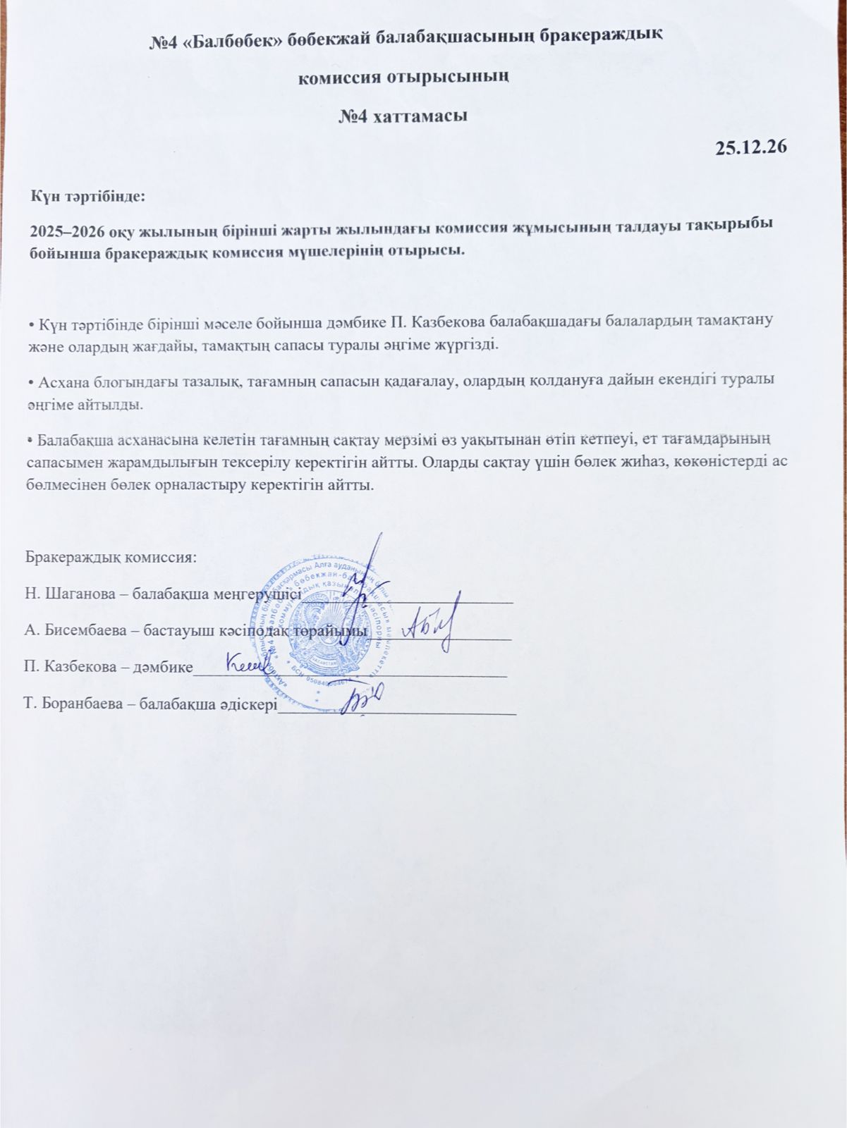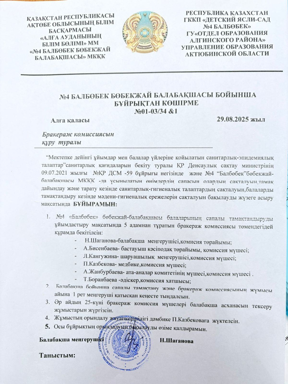 №4 «Балбөбек» бөбекжай-балабақшасы бойынша тамақтану жағдайы мен сапасын бағалау үшін 2025-2026 оқу жылына арналған бракеражды комиссия құру туралы бұйрық және жұмыс жоспары