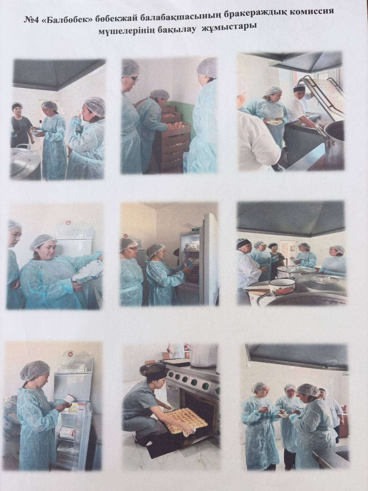 №4 «Балбөбек» бөбекжай-балабақшасыБракераждық комиссия мүшелерінің бақылау жұмысыКүні: 25 қыркүйек, 2025 жылМақсаты: Балабақша ас блогындағы тағамдардың дайындалу барысын және қоймадағы азық-түліктің сақталу сапасын тексеру жүргізілді.